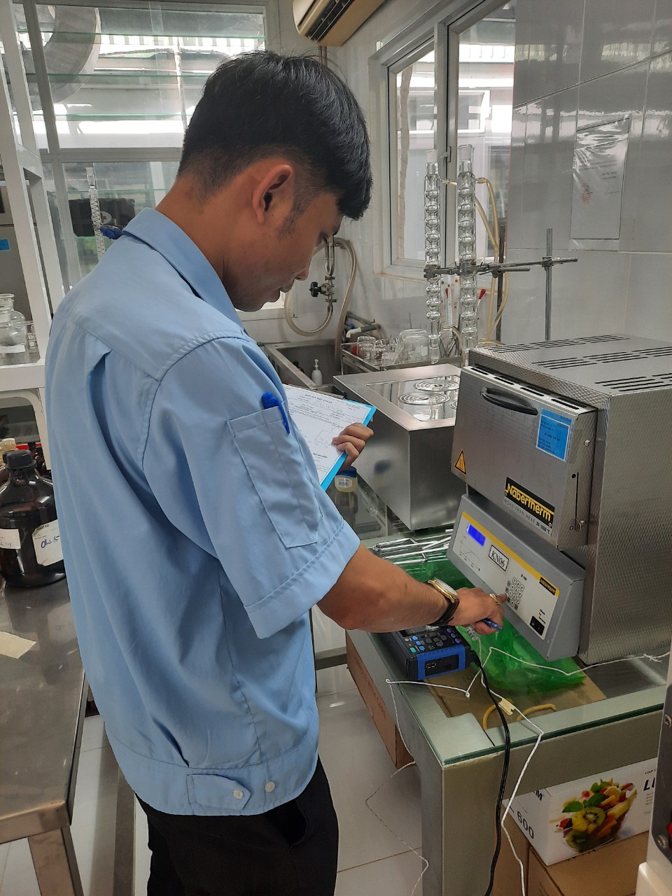 Hình kiểm định viên đang tiến hành hiệu chuẩn thiết bị tại Trung tâm Y tế huyện Bình Chánh